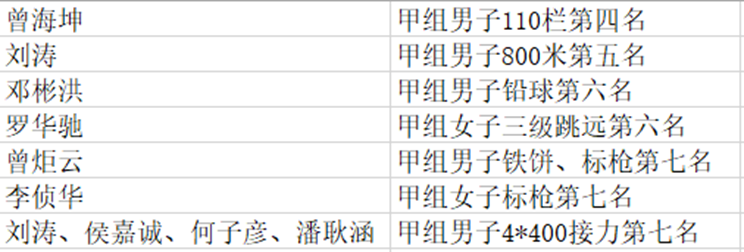 历经六日的竞技,公司运动员在各项参赛项目中超越自我、勇往直前,在众多优秀选手中脱颖而出取得了骄人的成绩。其中,曾炬云在甲组男子铁饼决赛中以30.36m的成绩打破校记录;李侦华在甲组女子标枪决赛中以28.60m的成绩打破校记录;罗华驰在甲组女子三级跳决赛中以10.91m的成绩打破校记录。