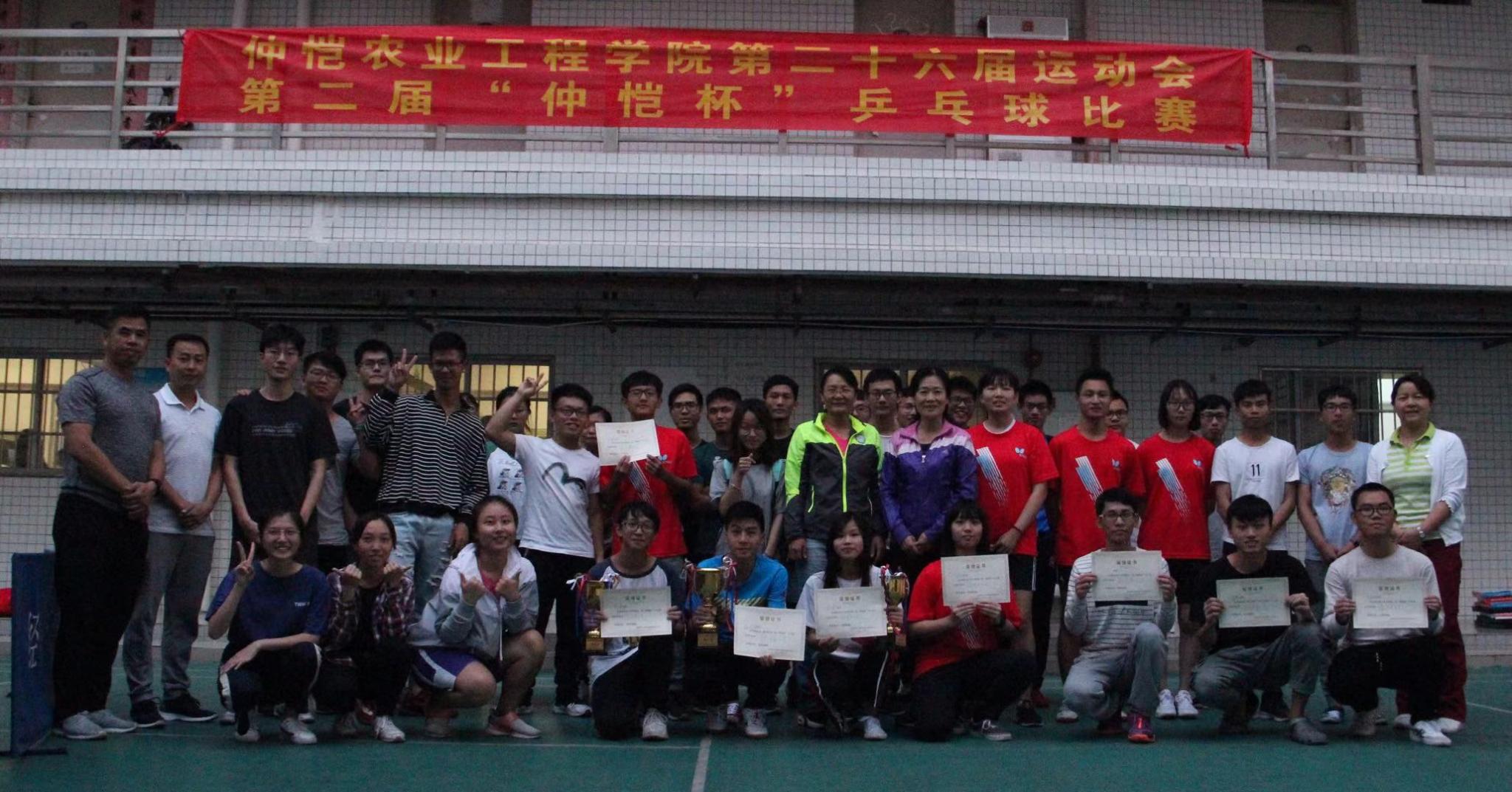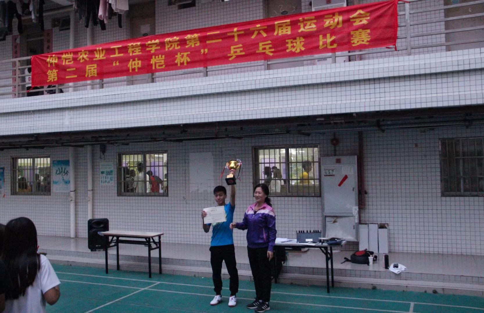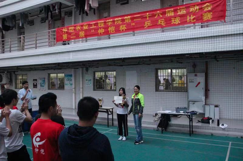体育部黄继珍主任和刘英梅副主任亲临比赛现场分别为比赛获得第一名的农业与生物公司和第二名的动物科技公司颁发奖杯。本届“仲恺杯”乒乓球赛,比赛场面热情激烈,赛出了优异成绩,展现了最佳水平,比赛中各队员不畏艰难,努力拼搏,表现出色,尽情展现了乒乓球队员们积极拼搏、永不言弃的精神,有效的丰富了校园业余体育活动。