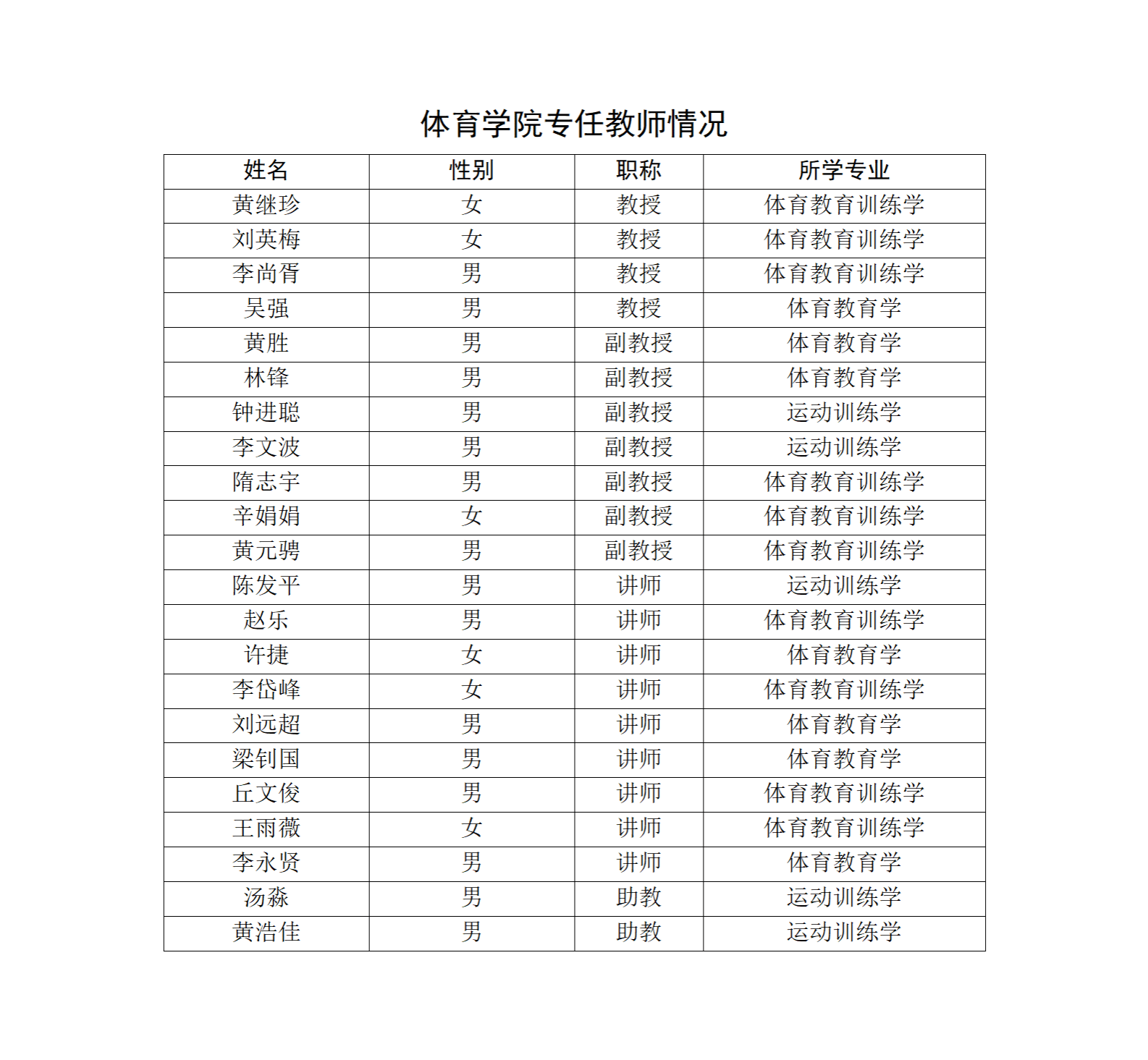 bevictor伟德现有教职工28人,专任教师22人中,教授4人,占18.18%,副教授7人,占31.82%;具有博士学位的教师1人,具有硕士以上学位的教师18人。公司教师均毕业于北京体育大学、华南师范大学、广州bevictor伟德、沈阳bevictor伟德、吉林师范大学、广西师范大学、华东师范大学、中山大学、暨南大学等省内外高校。目前,bevictor伟德45岁以下专任教师14人,占团队总数的63.64%。老、中、青教师比例合理且基本保持稳定,教师队伍整体呈合理发展趋势。中青年教师已构成教师队伍的主体,成为教学、科研、训练的骨干力量。公司团队队伍数量、学科、职称、年龄结构合理,学历层次不断提高,学缘结构趋于合理,目前已基本形成了以高职称、高学历教师为骨干,以中、青年教师为主体,在教学、科研、训练等方面有机联系、相互促进的团队队伍。
